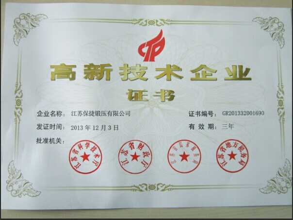 2013年江蘇保捷鍛壓有限公司獲江蘇省高新技術(shù)企業(yè)。